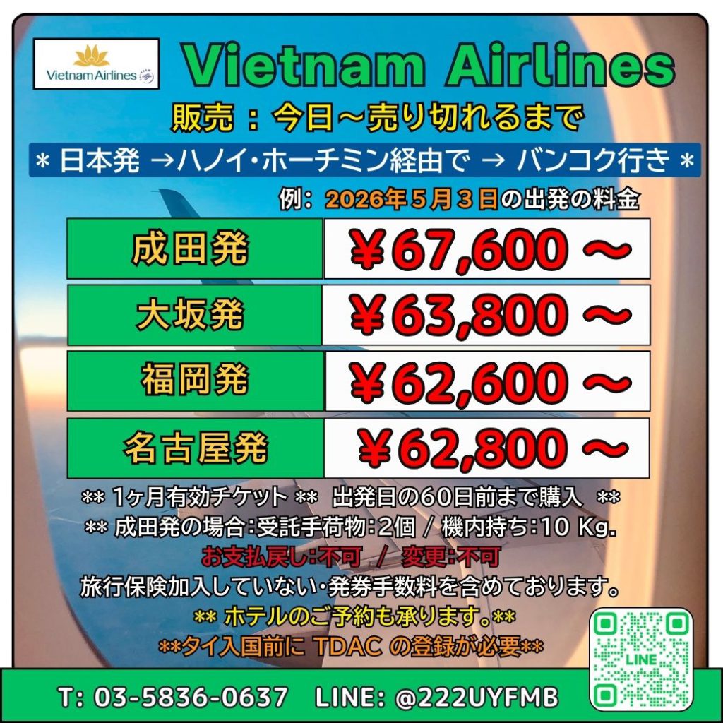 「Vietnam Airlines」ハノイまたはホーチミンを経由して、タイへ旅行に行きましょう!