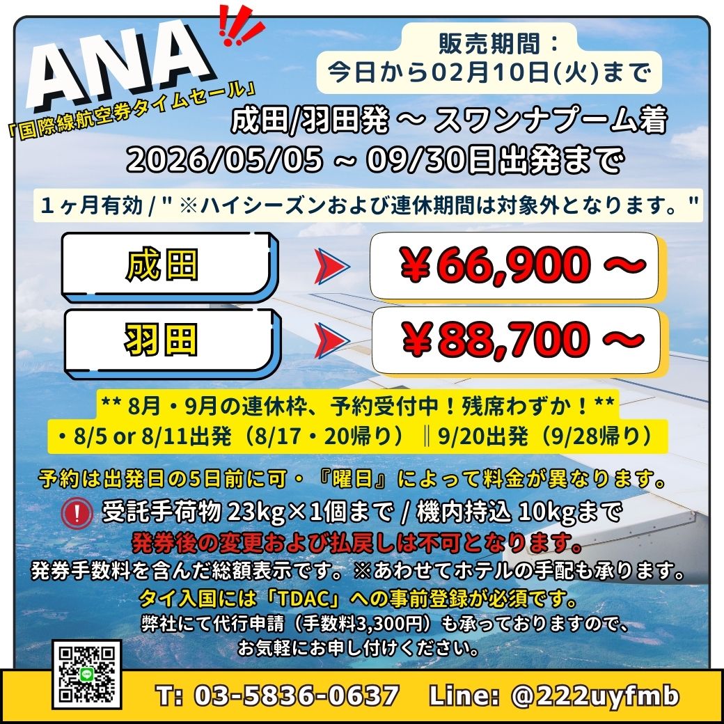 ANA (NH)【往復】「国際線航空券タイムセール!」02月10日(火)まで販売!